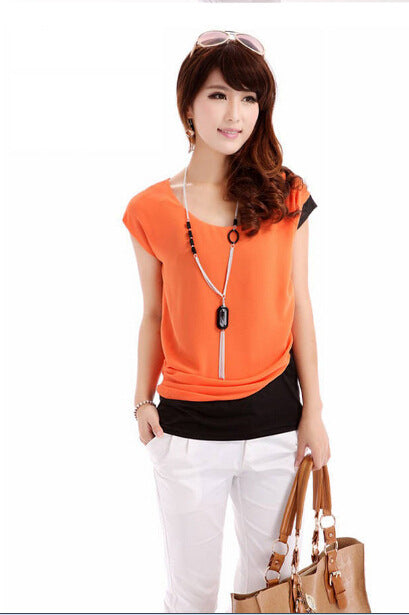 Round neck colorblock summer chiffon top. Shirt sleeve chiffon shirt