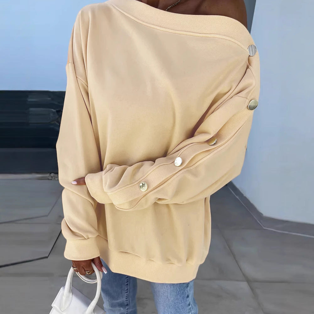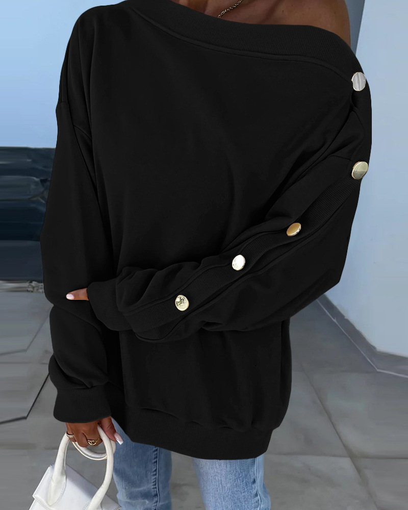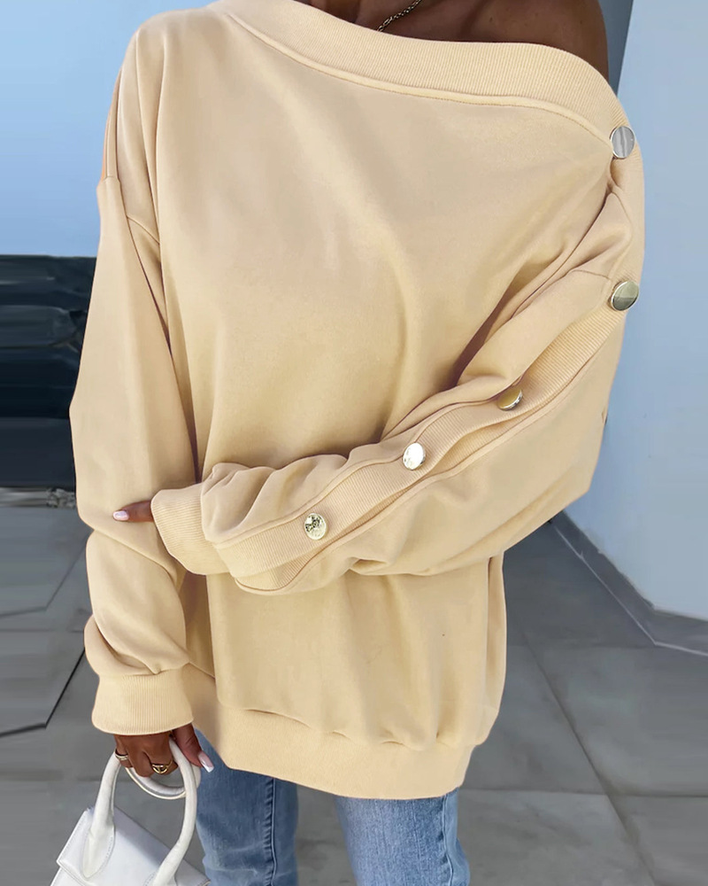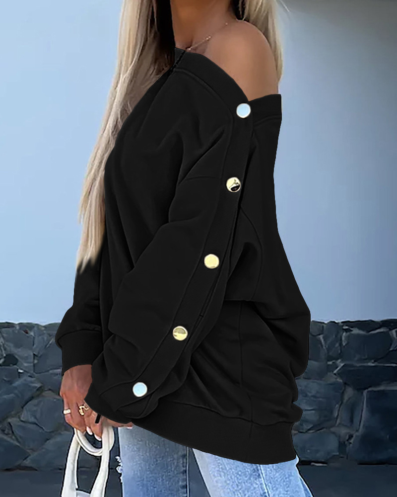 Asymmetric Neckline Button Sleeve Drop-shoulder Sweatshirt