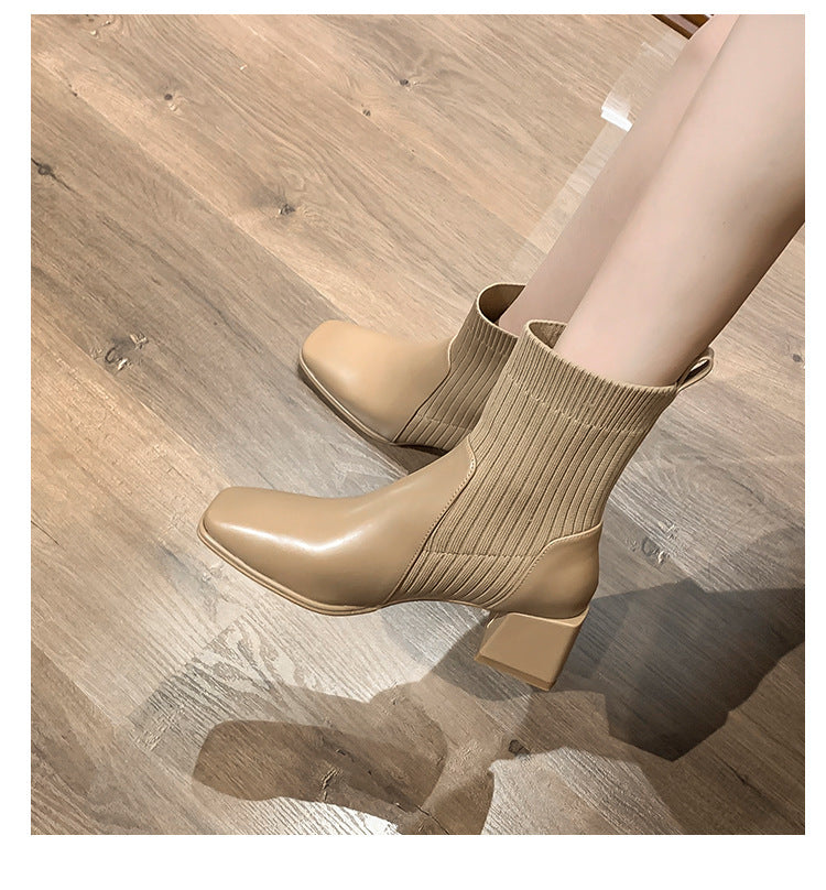 Chunky Heel Square Toe Knit Martin Boots