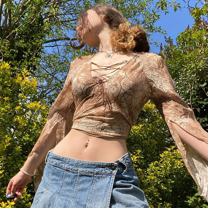 French Retro Net Gauze Abstract Print Flared Sleeve Top