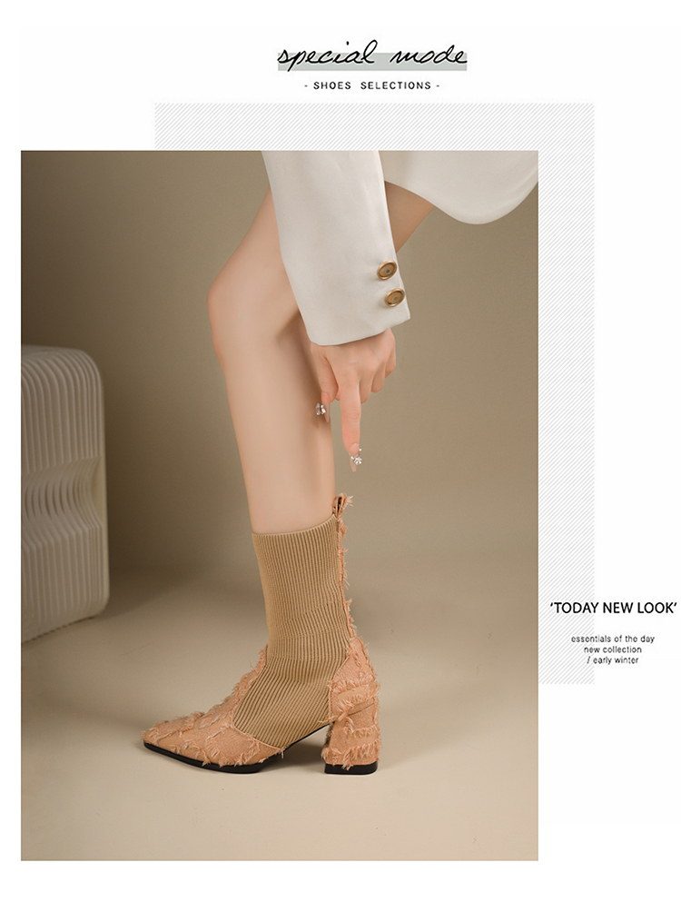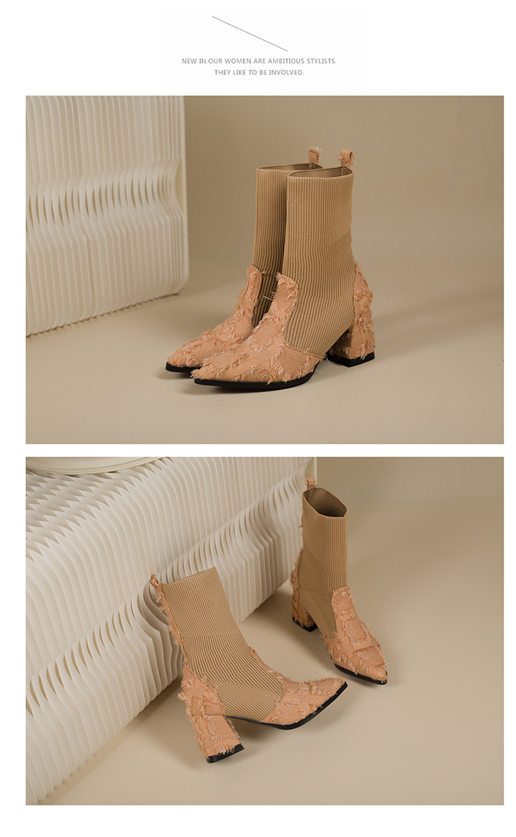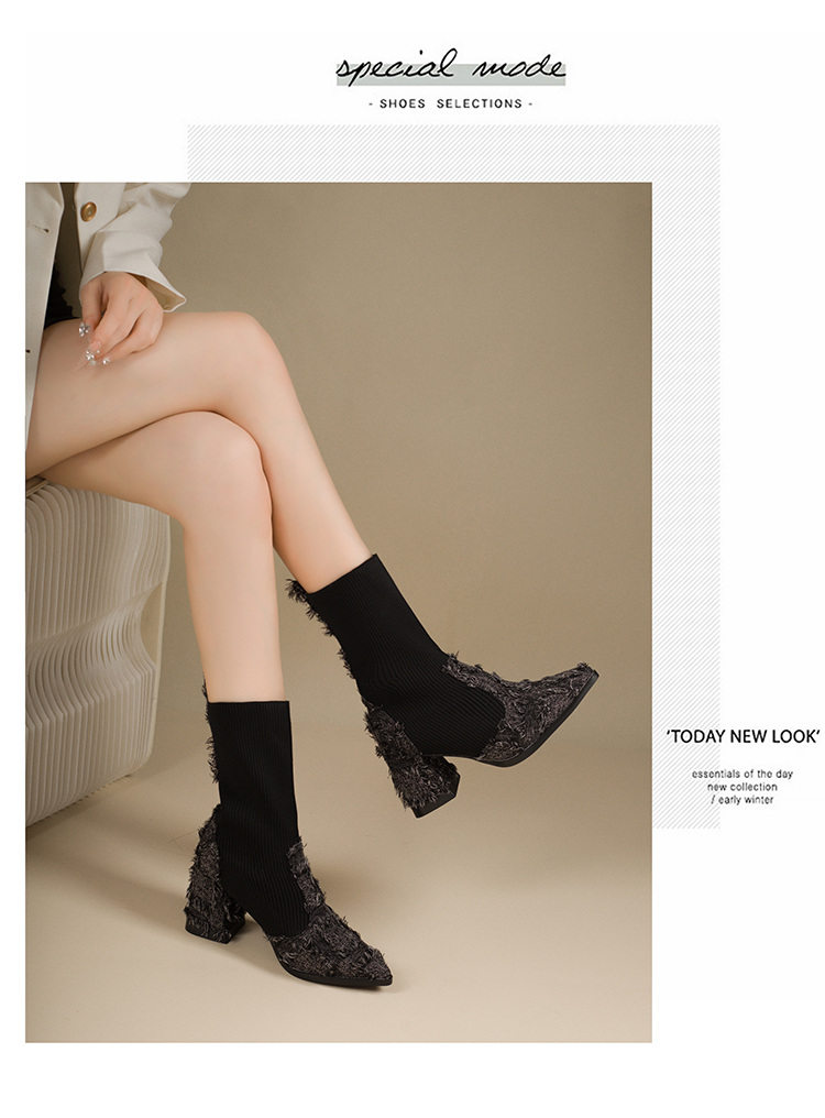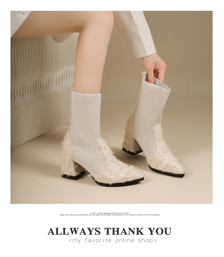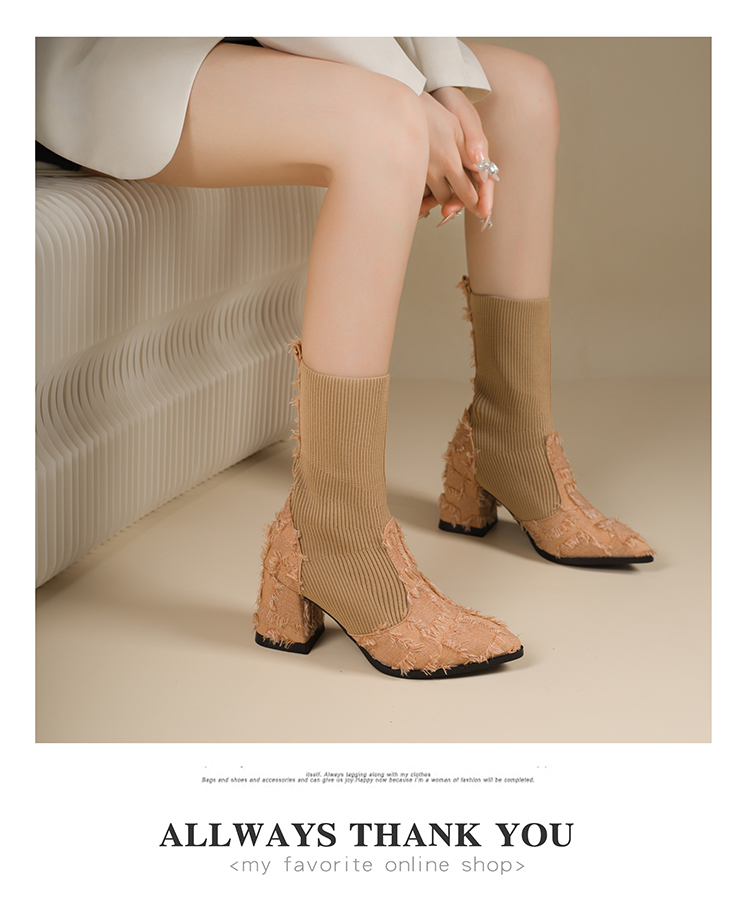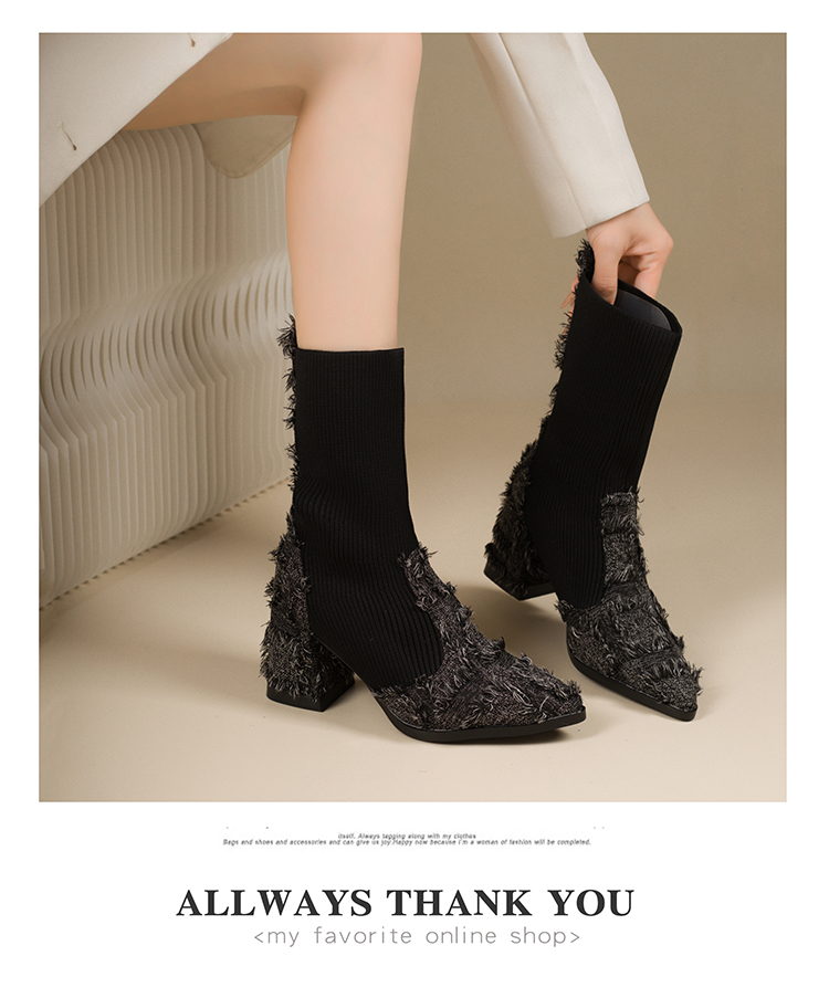 Women's Fringe And Knit Combination Mid-Calf Boots, Boho Chunky Block Heels