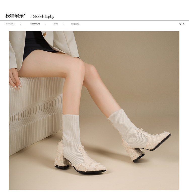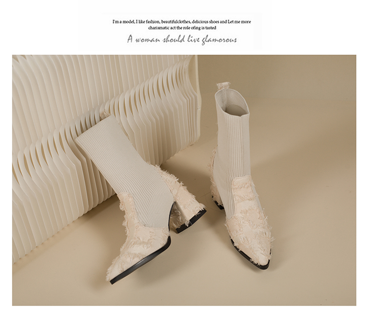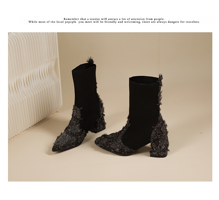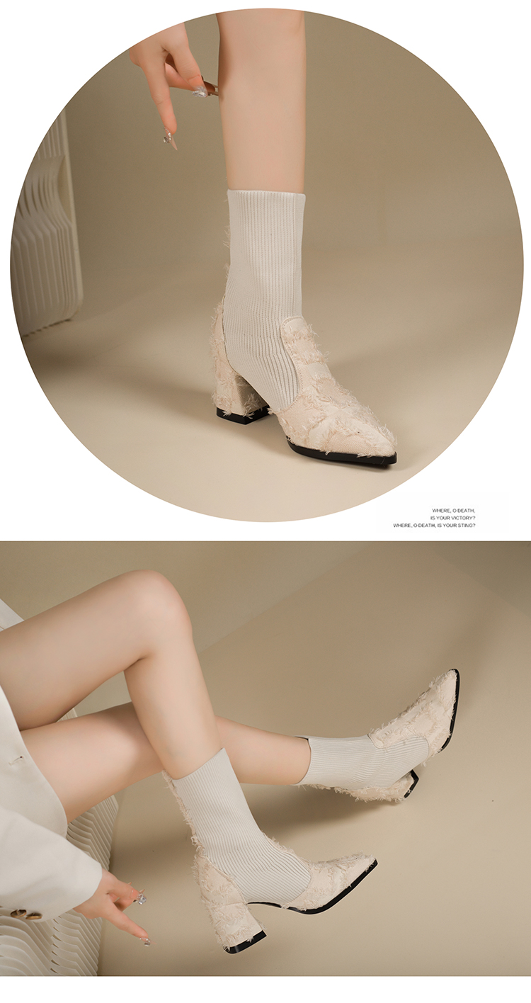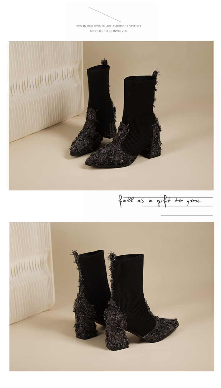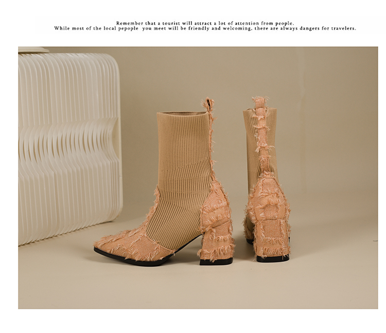 Women's Fringe And Knit Combination Mid-Calf Boots, Boho Chunky Block Heels